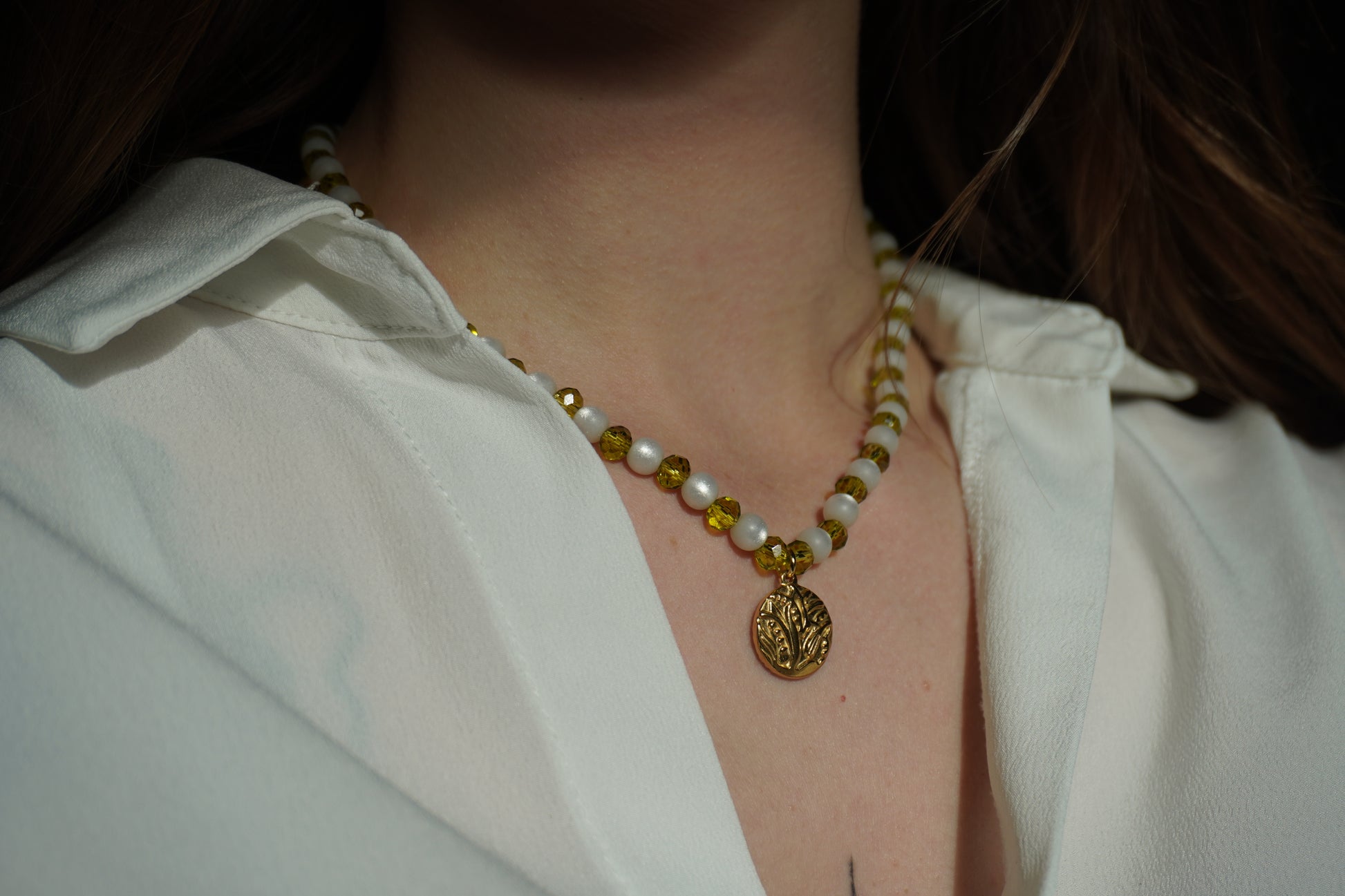 Un collier lumineux et frais, inspiré par la douceur des feuilles de verveine et la chaleur du soleil d’été. Ses perles vert tendre et nacrées s’accordent à l’or pour créer une harmonie végétale, douce et vivante. Chaque détail évoque la nature, la légèreté et la lumière.